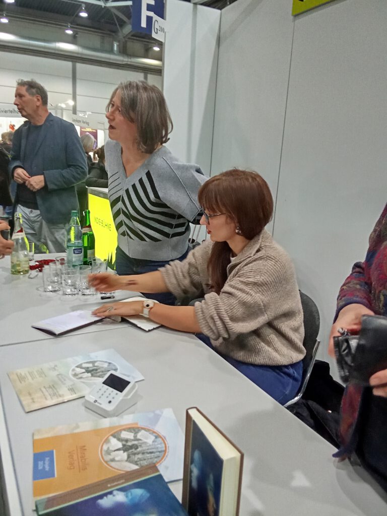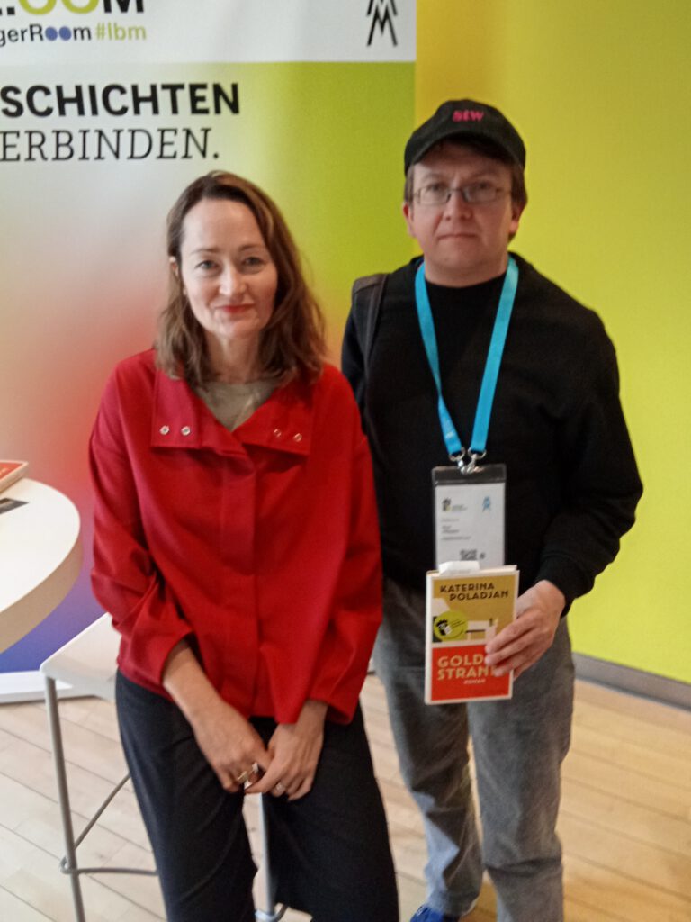 Vorher gab es ein Wiedersehen mit C. H. Beck, die erneut in der Kategorie Sachbuch gewinnen konnten (Marie-Janine Calcic „Balkan-Odyssee 1933-1941„). Danach hat Svenja Falk das ihre „Die letzten Tage der Diktatur“ (erschienen bei Klett-Cotta“ vorgestellt. Eine Gedicht-Lesung „Kultur und Krieg – Ukrainische Erfahrungen“ hat mich dagegen nicht ganz so überzeugt, eher schon Rasa Bugavicute-Pece, die aus ihrem Kinderroman „Der Junge, der im Dunkeln sah“ (erschienen bei Mirabilis) gelesen hat, wo ich nicht nur mit der Verlegerin, sondern auch, wie schon bei Filipenko, mit der jeweiligen Übersetzerin ins Gespräch gekommen bin.