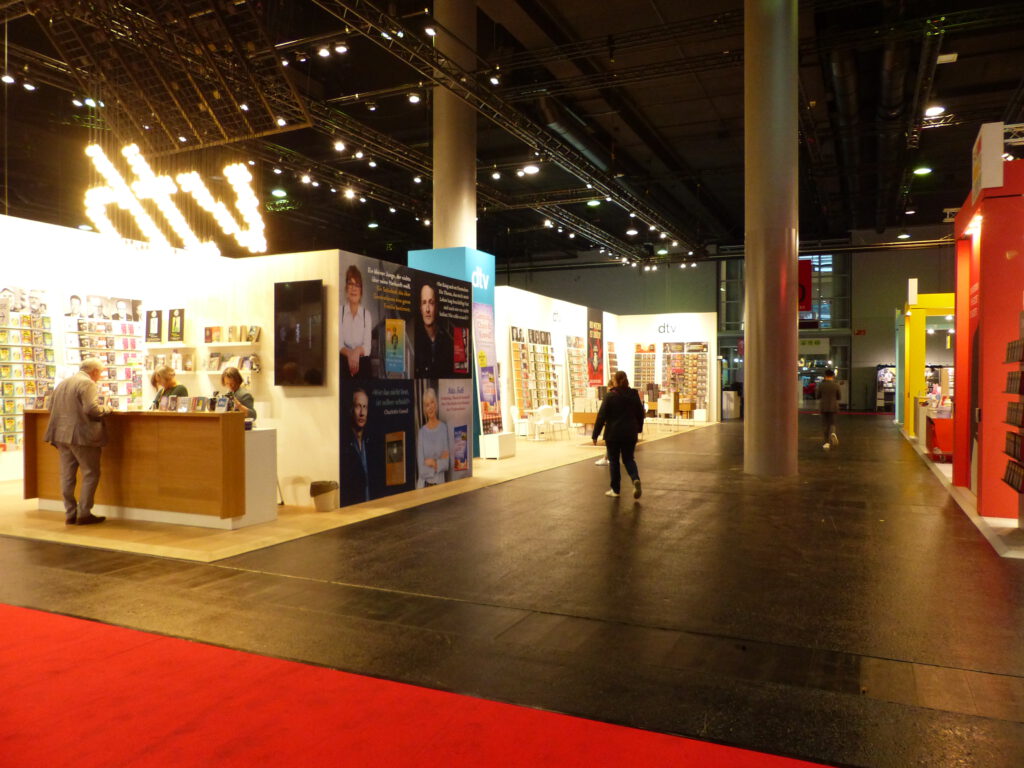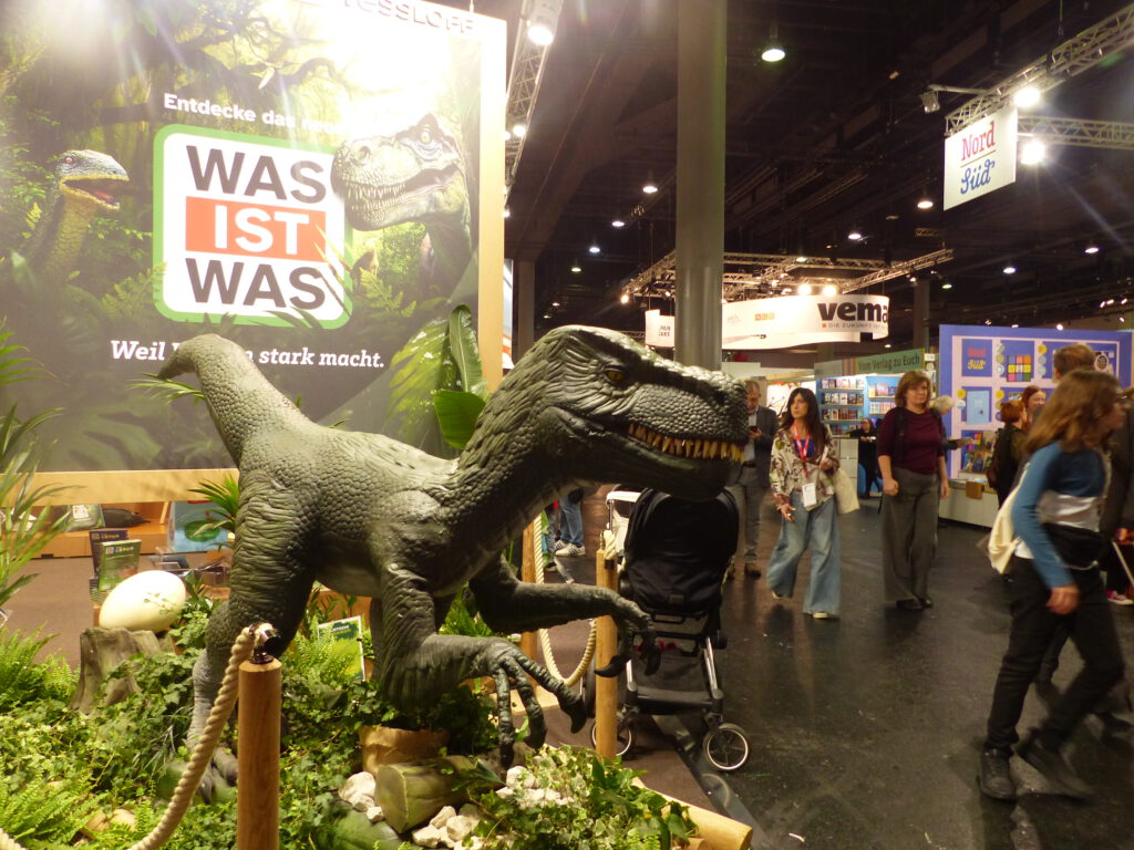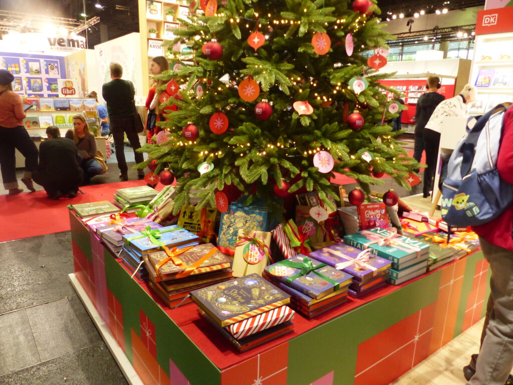 Bei Tessloff konnte man am irgendwie obligatorischen Messe-Dino vorbeigehen, bevor es dann in direkter Nachbarschaft zu Dorling Kindersley (DK-Verlag) ging, welcher mich bisher eigentlich immer mit seinen großformatigen und toll illustrierten Sachbüchern und Bild-Lexika begeistern konnte. Dort gab es ein Blogger-Treffen und einen festlich geschmückten Weihnachtsbaum, unter den schön arrangiert die tollen Werke des Verlags lagen. Diesmal habe ich kein Buch mitgenommen. Diese Werke haben Gewicht, welches man sonst die gesamte Zeit über mit sich herumschleppen müsste. Am Ende des Abends oder der Nacht sollte ich für diese Entscheidung noch dankbar sein.
