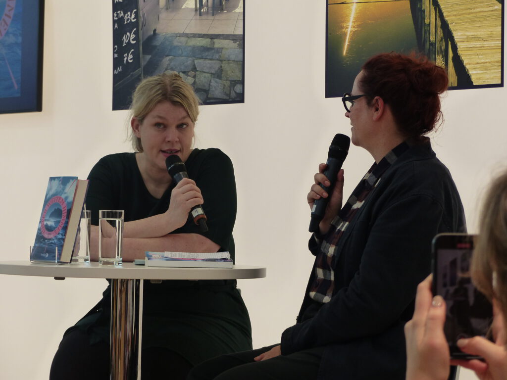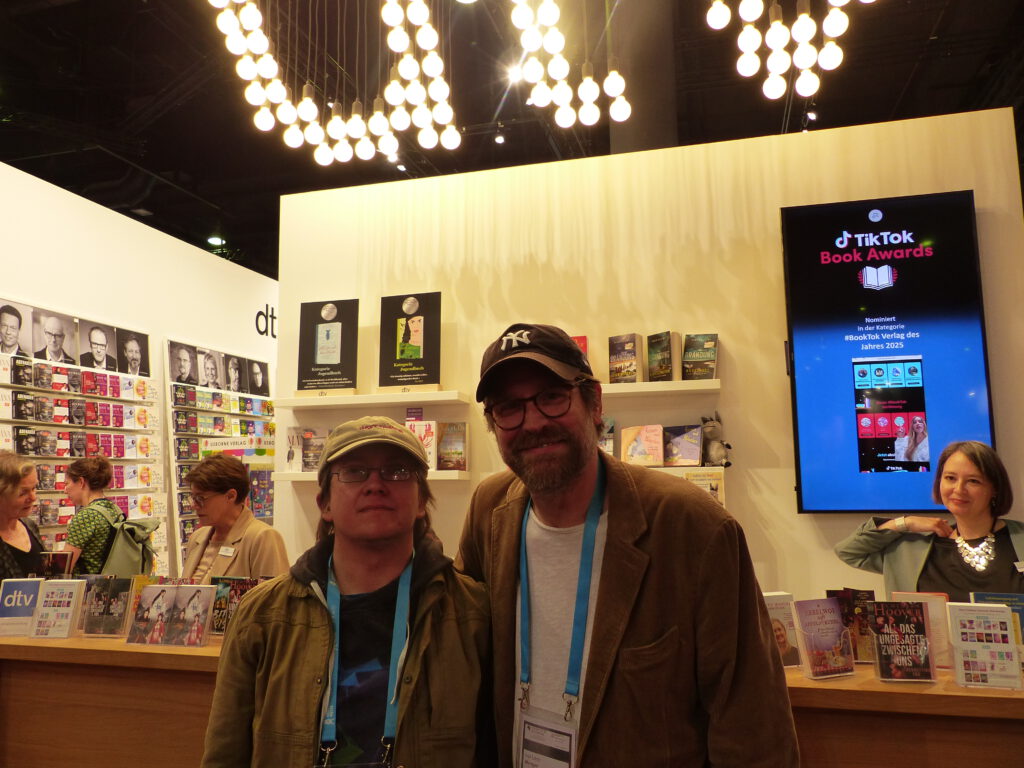 Tag 2 gab für mich das Motto der gesamten Messe. Für mich waren es Tage der Begegnungen. Dabei fing dieser eine mit einer ganz normalen Lesung an, von Gabriel Zuchtriegel, der in einem Gespräch sein Sachbuch „Pompejis letzter Sommer“ vorgestellt hat. Anschließend habe ich weitere Lesungen geplant, doch bin dann am Stand vom Mirabilis-Verlag hängengeblieben, wo sich nach und nach eine lockere Runde an Büchermenschen und auch sonst gebildet hatte. Die Autorin Martina Berscheid war dort, ebenfalls Achim Kinter, Florian L. Arnold, der selbst seinen nebenan platzierten Verlagsstand der Edition Hibana betreute, sowie die Künstlerin Martina Altschäfer (und viele andere, die ich hier vergessen habe). Auch eine Redakteurin vom SWR hat sich dazu gesellt, die sich Inspiration für eine Sendung holen wollte. Mit vielen Anregungen und Ideen für neue Projekte war dieser Austausch schon da eines der Highlights der diesjährigen Messe.